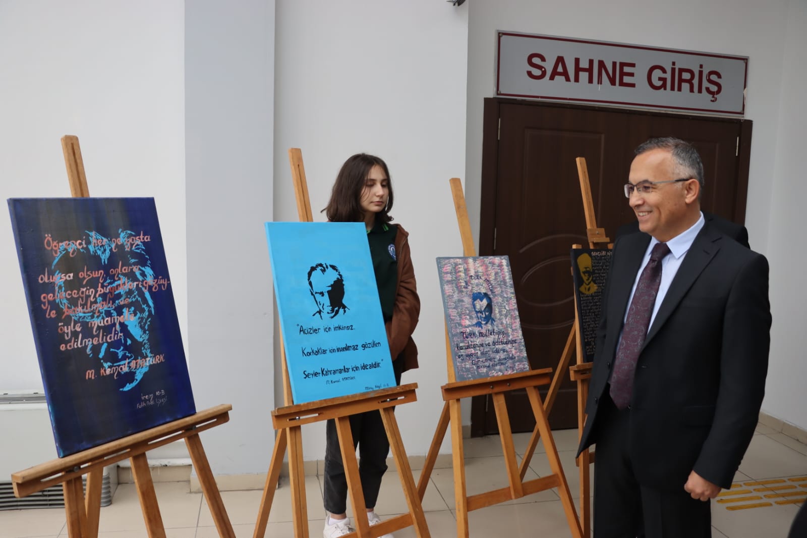 Vali Çeber, anma programı öncesinde “Atatürk’ten Özdeyişler” resim sergisini gezerek, sergiye katkı sunan öğretmen ve öğrencileri tebrik etti.