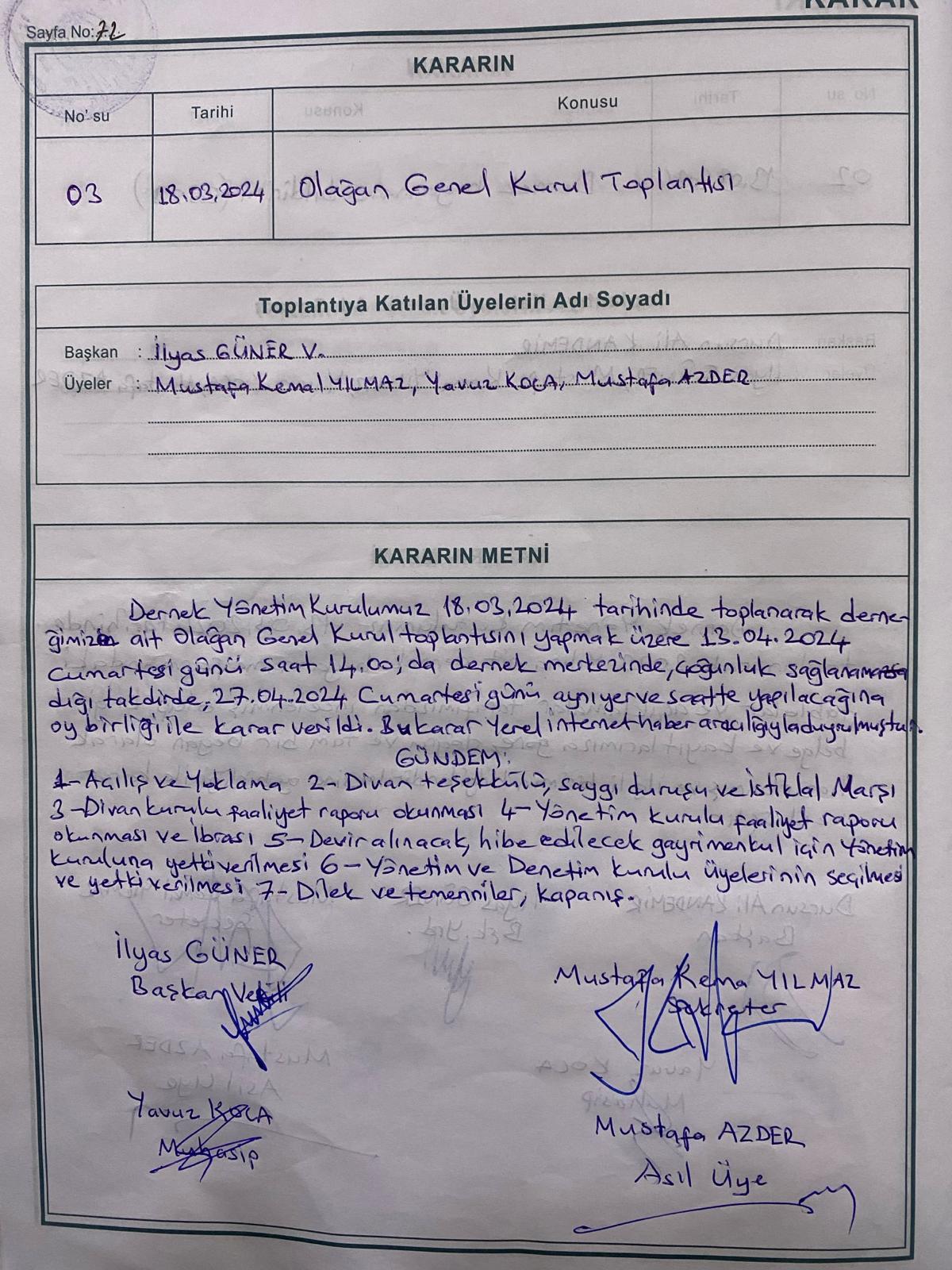 Kalkandere İmam Hatipliler Derneği yönetim kurulu 18.03.2024 tarihinde dernek merkezinde yaptığı toplantıda 13.04.2024  tarihinde saat 14:00 de dernek merkezinde olağan genel kurul kararı aldı.