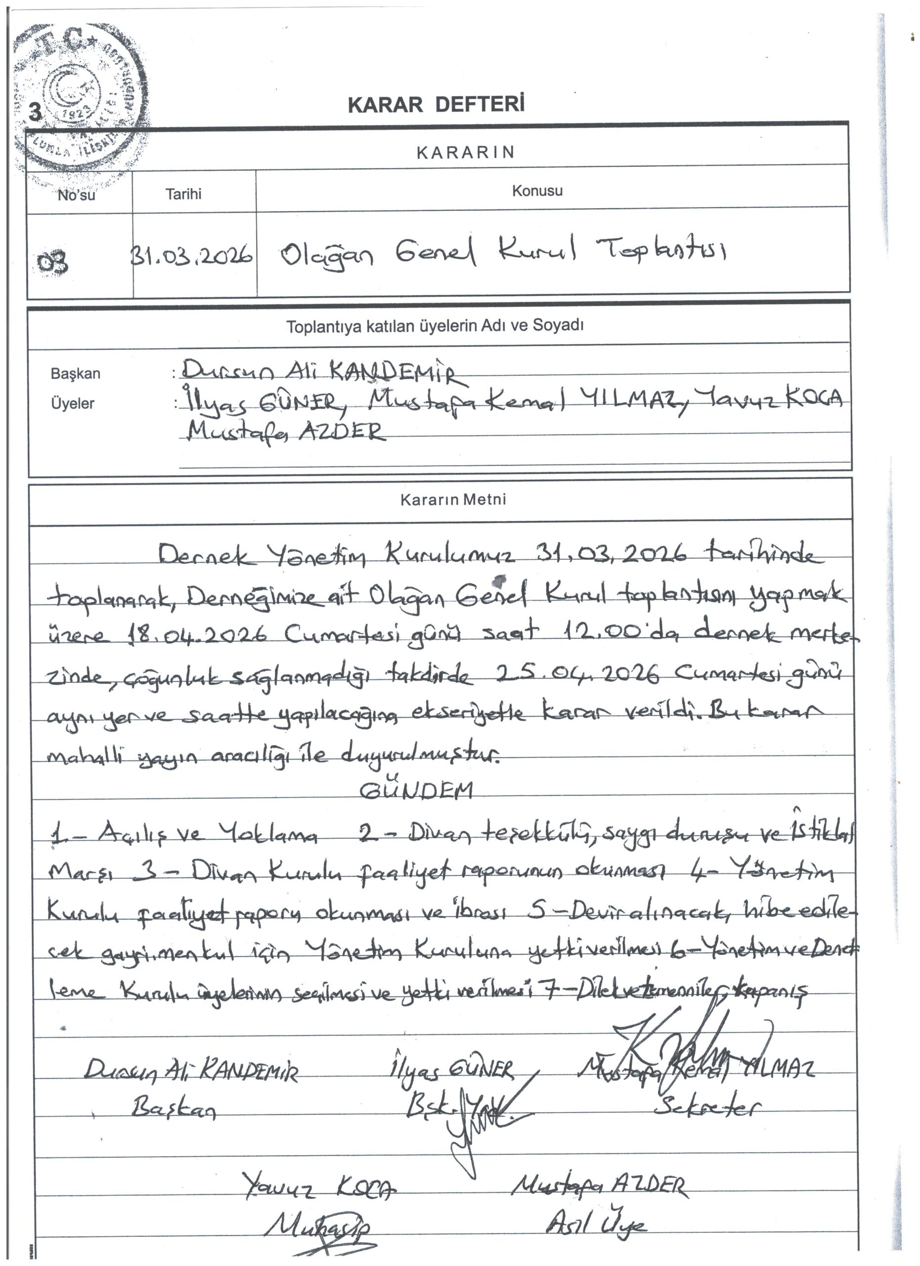 Kalkandere İmam Hatipliler Yardımlaşma Derneği yönetim kurulu 31.03.2026 tarihinde dernek merkezinde yaptığı toplantıda 18.04.2026 tarihinde saat 12:00 de dernek merkezinde olağan genel kurul kararı aldı.