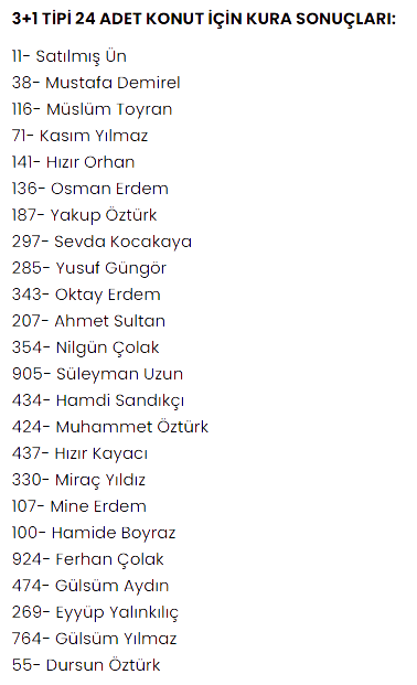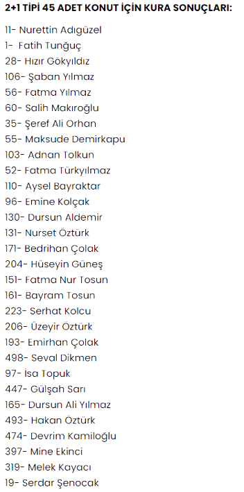 Kalkandere Yukarıtatlısu mahallesinde bulunan 69 adet konut projesi kapsamında 2+1 daire 45 adet 3+1 daire 24 adet olmak üzere toplamda 69 adet konutun kura çekim sonuçları :