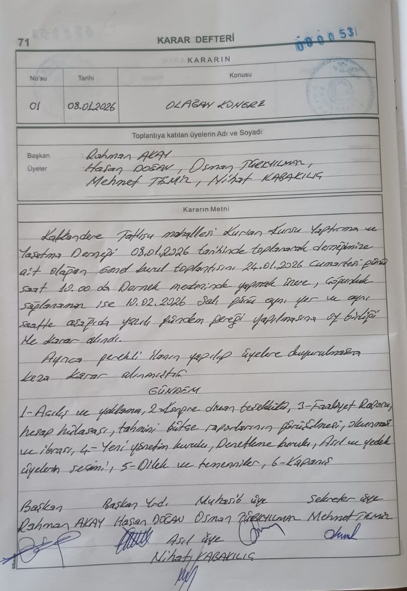 Kalkandere Tatlısu mahallesi Kuran Kursu Yaptırma ve Yaşatma derneği yönetim kurulu üyeleri dernek genel merkezinde 08.01.2026 tarihinde toplanarak 24.01.2026 cumartesi günü saat 10:00 da olağan genel kurul kararı almıştır. Kurul toplantısın da alınan kararla