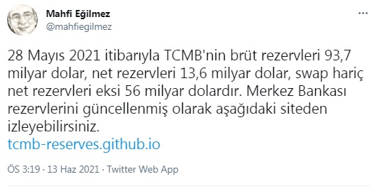 Bu açıklamanın ardından Ekonomist Mahfi Eğilmez, Twitter hesabından TC Merkez Bankası net rezervlerinin 13,6 milyar dolar olduğunu yazdı. Eğilmez swap anlaşmaları hariç Merkez Bankası rezervinin ise eksi 56 milyar dolar olduğunu belirtti.