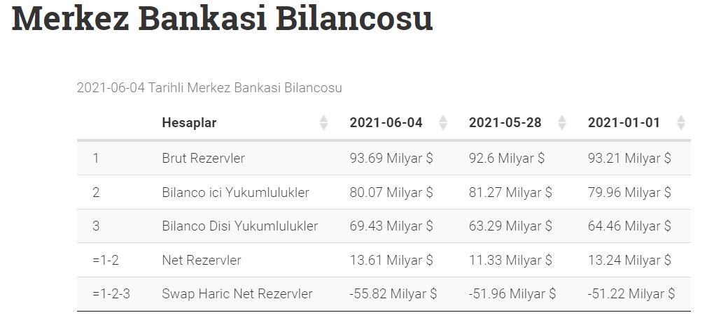 “28 Mayıs 2021 itibarıyla TCMB’nin brüt rezervleri 93,7 milyar dolar, net rezervleri 13,6 milyar dolar, swap hariç net rezervleri eksi 56 milyar dolardır. Merkez Bankası rezervlerini güncellenmiş olarak aşağıdaki siteden izleyebilirsiniz. https://tcmb-reserves.github.io”