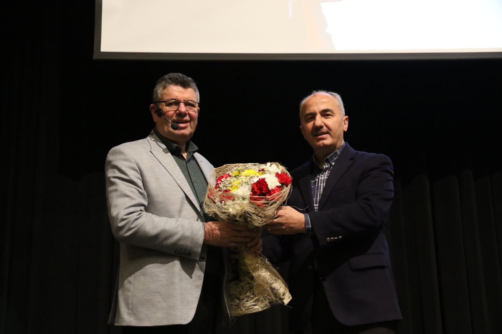 İlgiyle izlenen konferans sonunda Rize Belediye Başkanı Rahmi Metin, Alişan Kapaklıkaya’ya hediye takdim etti.