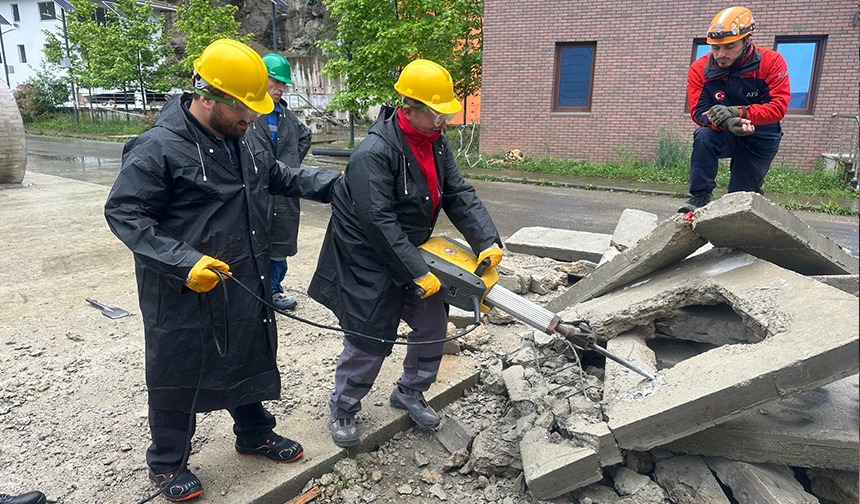 Rize İl Afet ve Acil Durum Müdürlüğü yerleşkesinde hafif arama kurtarma, enkazdan yaralı taşıma teknikleri, çadır kurma, emniyet ve güvenlik, kesme, kırma ve delme, dağcılık, malzeme kullanımı ve bakımı konusunda eğitim alan imamlar, ekiplerle birlikte tatbikat yaparak öğrendiklerini pratiğe dökme imkanı da buldu.