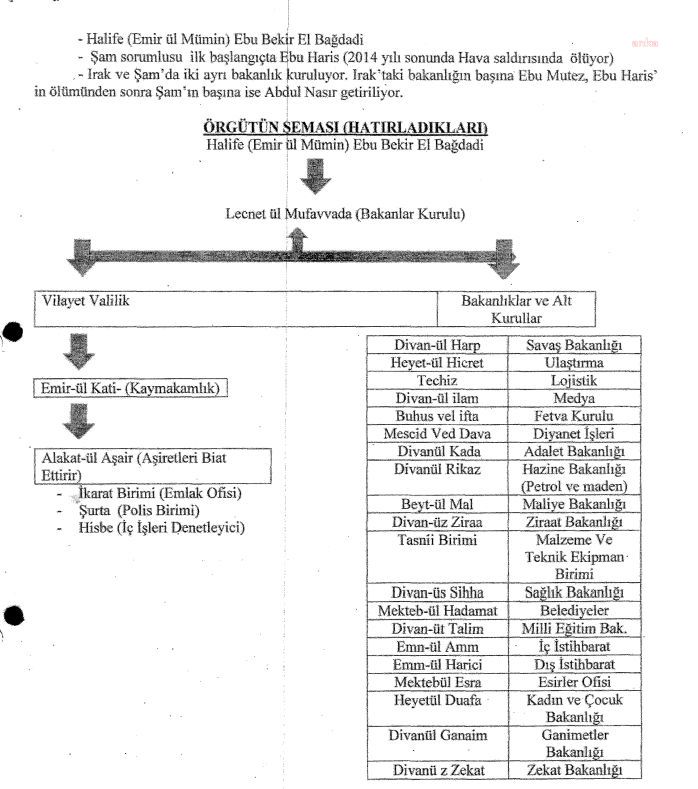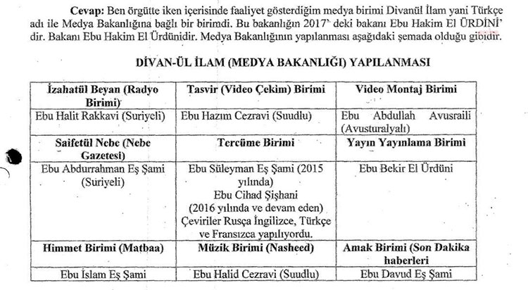 Yetek, IŞİD’in yönetim şemasını da polisle paylaştı. Şemada, kadın ve çocuk bakanlığından kaymakamlığa kadar birçok devlet yapısına benzer organının olduğu görüldü. Yetek, çalıştığı medya bakanlığının şemasını da aktardı.