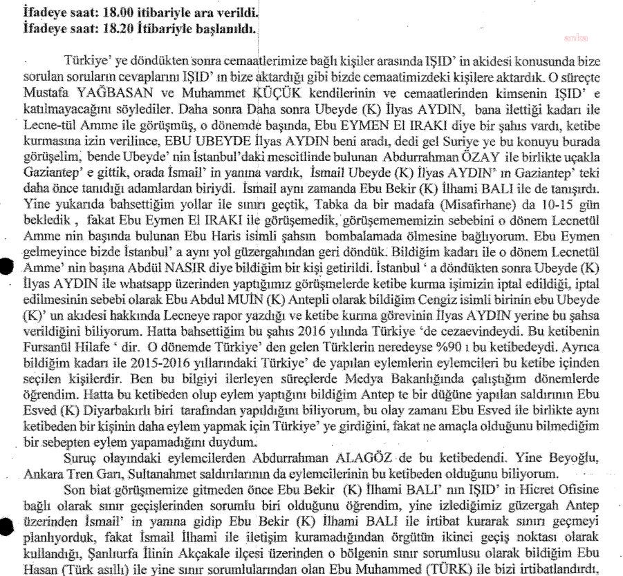 “Hatta bahsettiğim bu şahıs (Cengiz) 2016 yılında Türkiye’de cezaevindeydi. Bu ketibenin Fursanül Hilafe’dir. O dönemde Türkiye’den gelen Türklerin neredeyse yüzde 90’ı bu ketibedeydi. Ayrıca bildiğim kadarıyla 2015-2016 yılındaki Türkiye’de yapılan eylemlerin eylemcileri, bu ketibe içinden seçilen kişilerdir. Ben bu bilgiyi ilerleyen süreçlerde medya bakanlığında çalıştığım dönemlerde öğrendim. Hatta bu ketibenden olup, eylem yaptığını bildiğim Antep’te bir düğüne yapılan saldırının Ebu Esved ile birlikte aynı ketibeden bir kişinin daha eylem yapmak için Türkiye’ye girdiğini, fakat ne amaçla olduğunu bilmediğim sebepten eylem yamadığını duydum. Suruç olayındaki eylemcilerden Abdurrahman Alagöz de bu ketibedendi. Yine Beyoğlu, Ankara Tren Garı, Sultanahmet saldırılarının da eylemcilerinin bu ketibeden olduğunu biliyorum.”