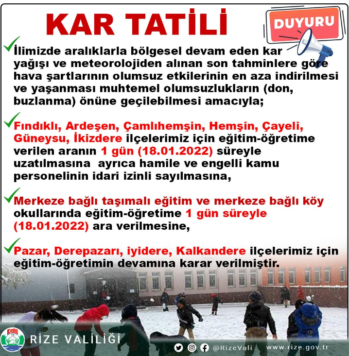 Kar yağışı nedeniyle Rize’de taşımalı eğitime 1 gün (17/01/2022) ara verildi!